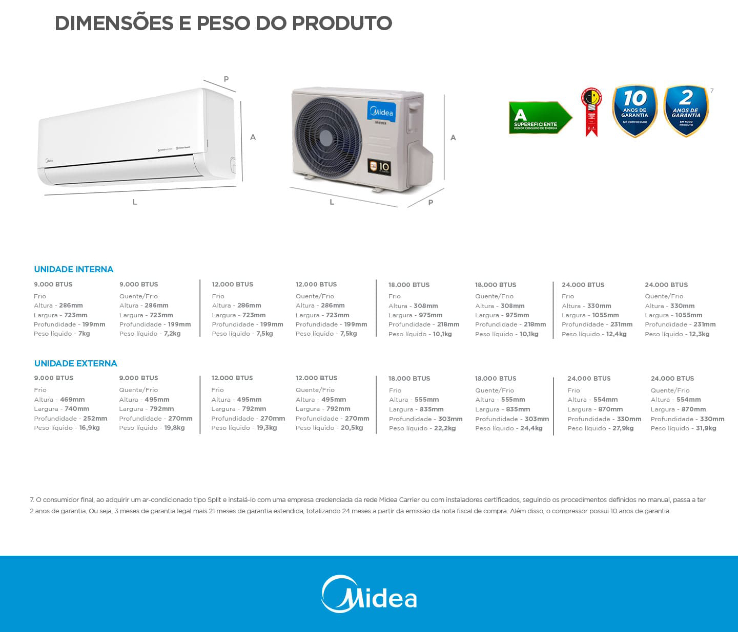 Peso líquido unidade interna: 7,20 kg