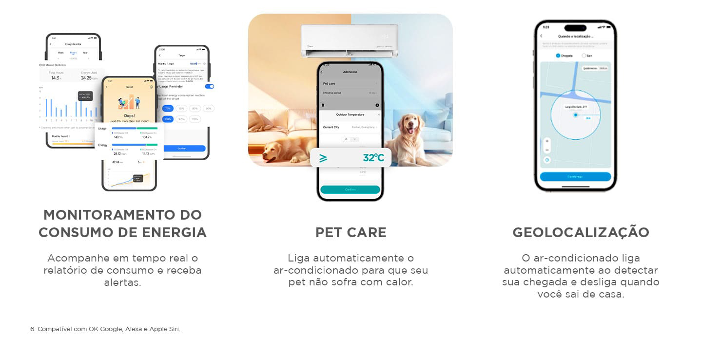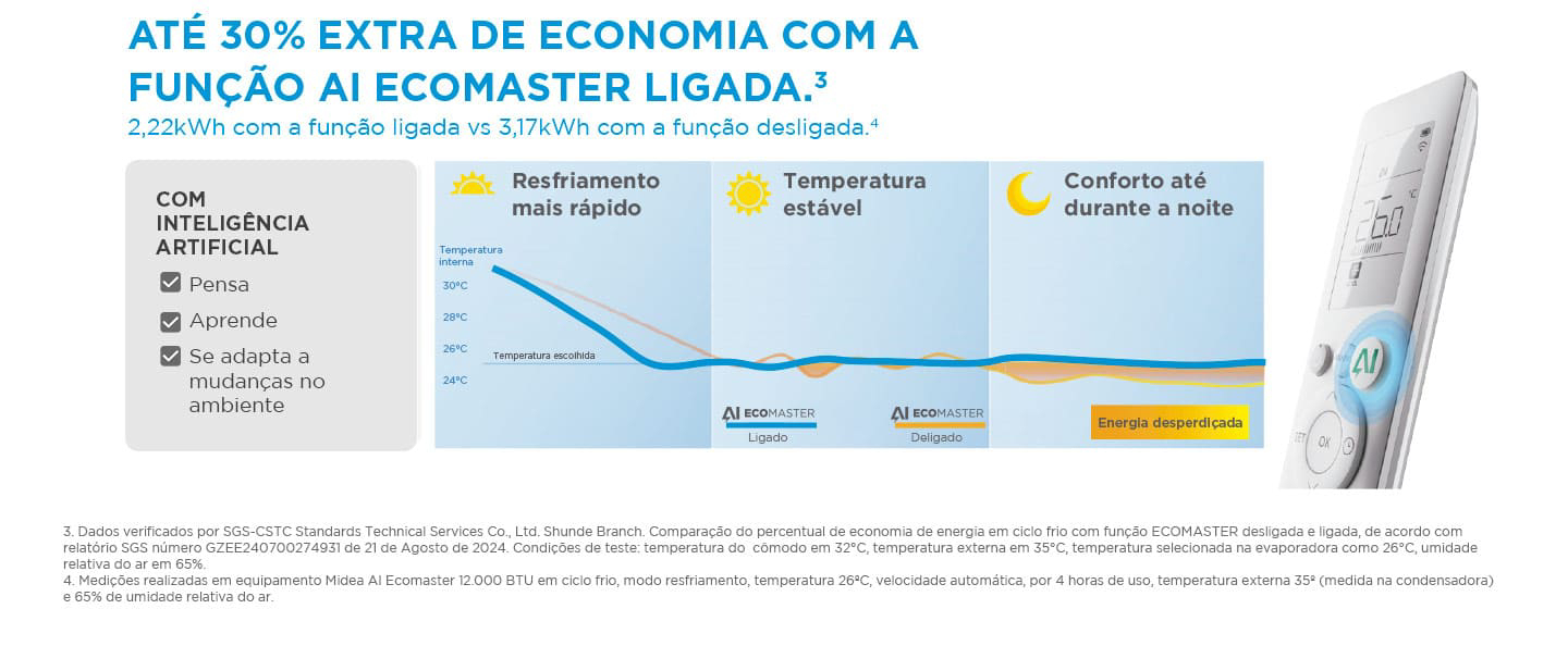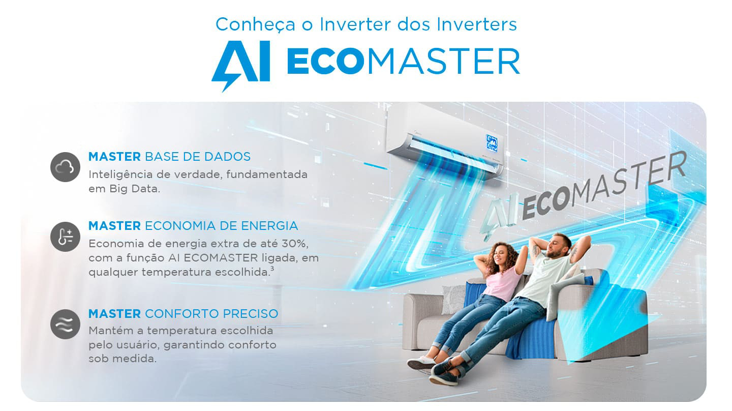 O Ar-Condicionado Split HW Inverter Midea AI Ecomaster é um modelo inteligente que combina tecnologia de ponta, economia de energia e alto conforto térmico. Graças à tecnologia de Inteligência Artificial (AI), o equipamento analisa bilhões de dados, aprende a rotina do usuário e ajusta automaticamente seu funcionamento.